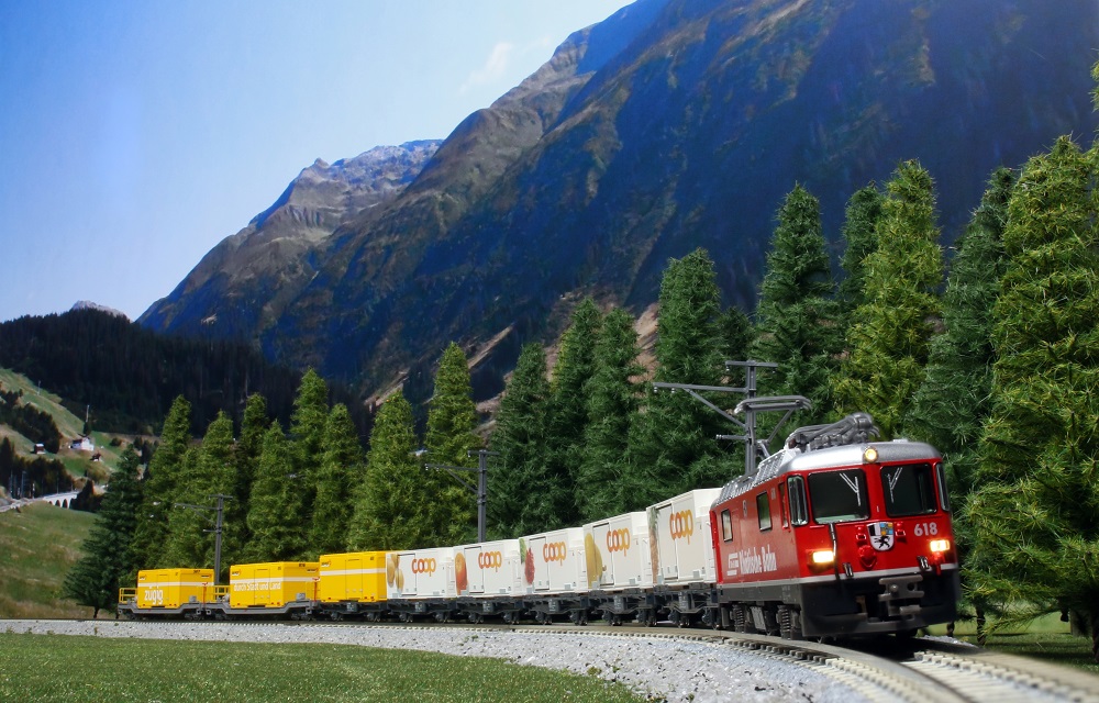 レーティッシュ鉄道各線において鉄道貨物輸送は、険しいスイスアルプスの山岳地帯で食料や飲料、郵便などを運送する