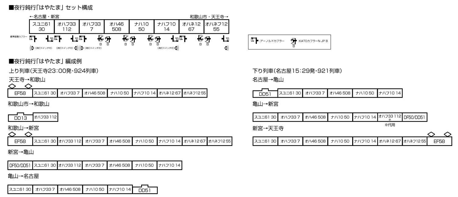 オハフ33・オハ46・ナハ10・ナハフ10:「天王寺⇔名古屋」/オハネ12・オハネフ12:「天王寺⇔新宮」