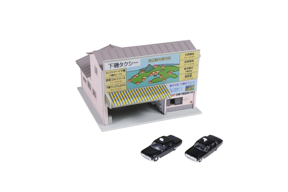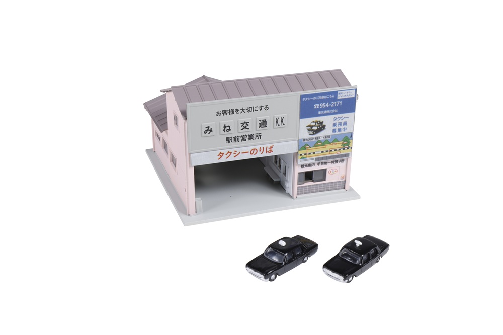 駅前のほかに街中のどんな景観にも馴染むタクシー営業所が登場です。ローカルシーンを手軽に再現できる塗装済みストラクチャーで、時代に関連する人形や自動車と併せてジオラマを演出したり、ユニトラムのテーマに沿った沿線の街並み景観を構成する建物としてオススメです。