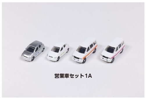 レイアウトを引き立てるNゲージサイズのミニカーに、営業車とタクシーが登場です。