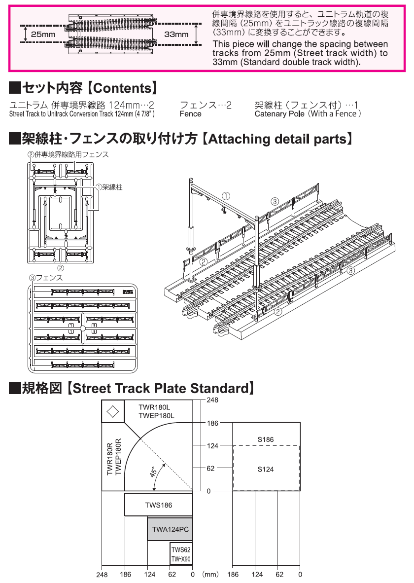 ・セット内容:ユニトラム併専境界線路 124mm×2、フェンス×2、架線柱(フェンス付)×1