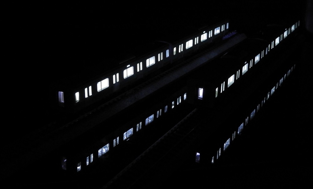 ・先頭車はヘッド/テールライト、前面行先表示点灯(電球色LED採用)。10号車・11号車・15号車は消灯スイッチ付